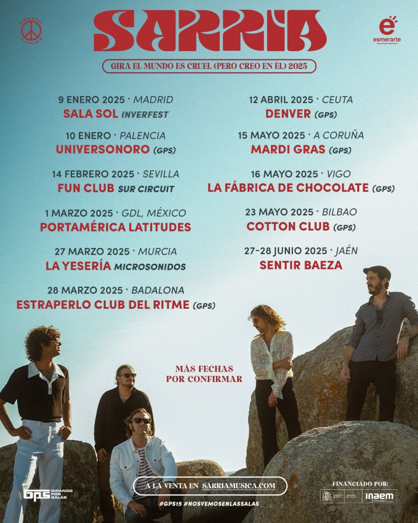 Sarria confirma las primeras paradas de su gira de salas y festivales para 2025, con un total de 10 conciertos confirmados y más fechas por anunciar próximamente. Entre ellas, seis citas cuentan con el respaldo de Girando Por Salas (GPS), al haber sido seleccionado entre los 22 artistas de la 15ª edición.